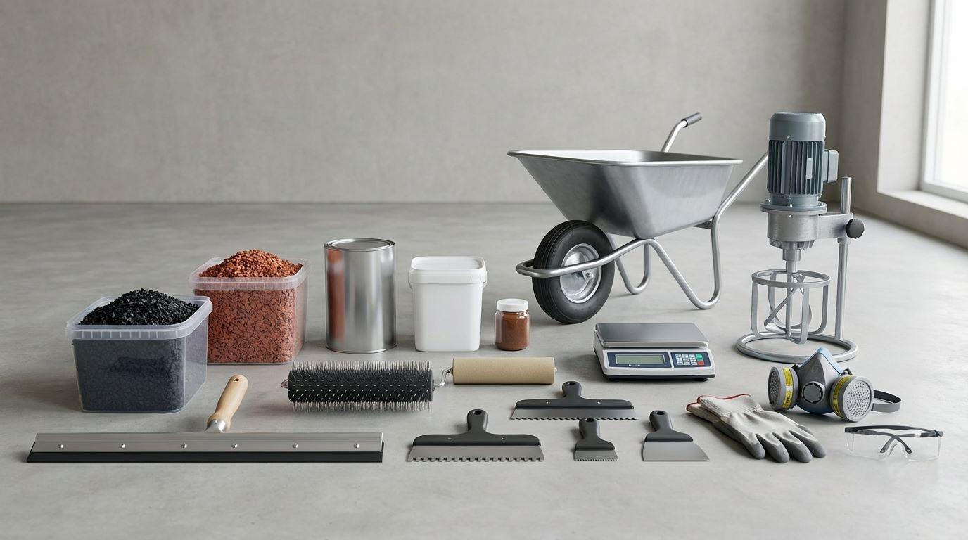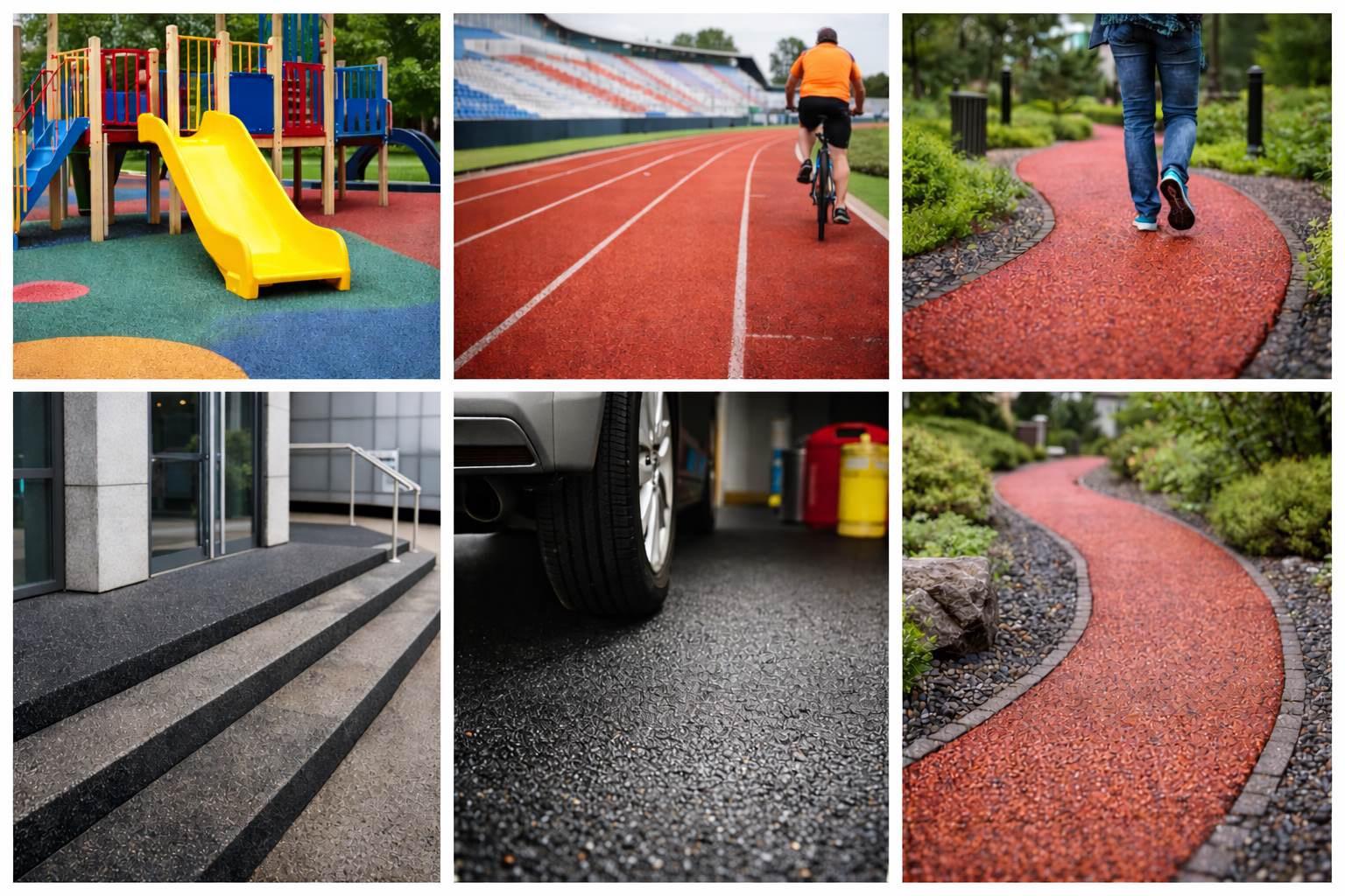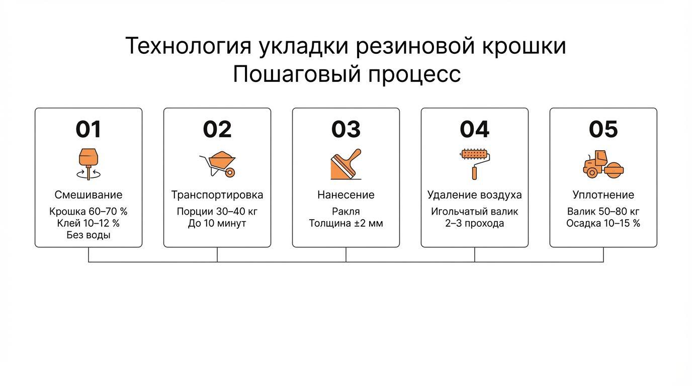 Для придания основанию дополнительной прочности и улучшения адгезии часто используется мягкий асфальт в мешках, который распределяется по подготовленной поверхности и формирует дополнительный слой перед укладкой резиновой крошки. Крошка полимерная смешивается с полиуретановым связующим — клеем для укладки резиновой крошки — в специальных смесителях, обеспечивая получение однородной и эластичной массы. Эта масса после подготовки равномерно распределяется по основанию, формируя ровную и прочную поверхность.